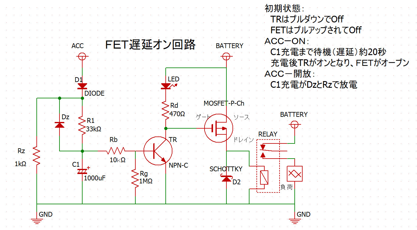 遅延オフの時は、FETの回路にコンデンサを挟んで切断を遅延させていたのだが、遅延オンはどうすれば?