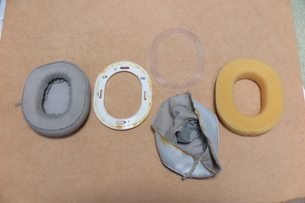 せっかくなので、修理できないか試してみる。イヤーパッドをヘッドホンから外し、イヤーパッド自体を分解。底板とスポンジとダメになったカバーに分かれた。スポンジはまだ生きているみたいだ。ダメなのはそのカバーとなる布だけがダメっぽい。