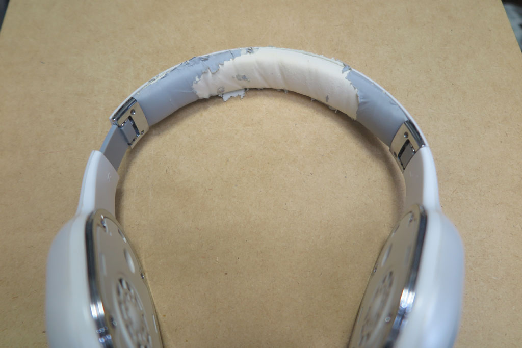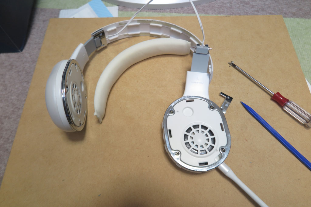 頭頂部も何とかしなきゃなので、左右連結部分も分解する。接合部分を外したらクッションが取れたので、クッションのボロボロ部分をきれいには剥ぎ取った。