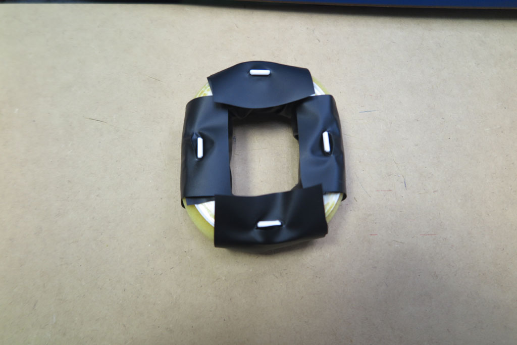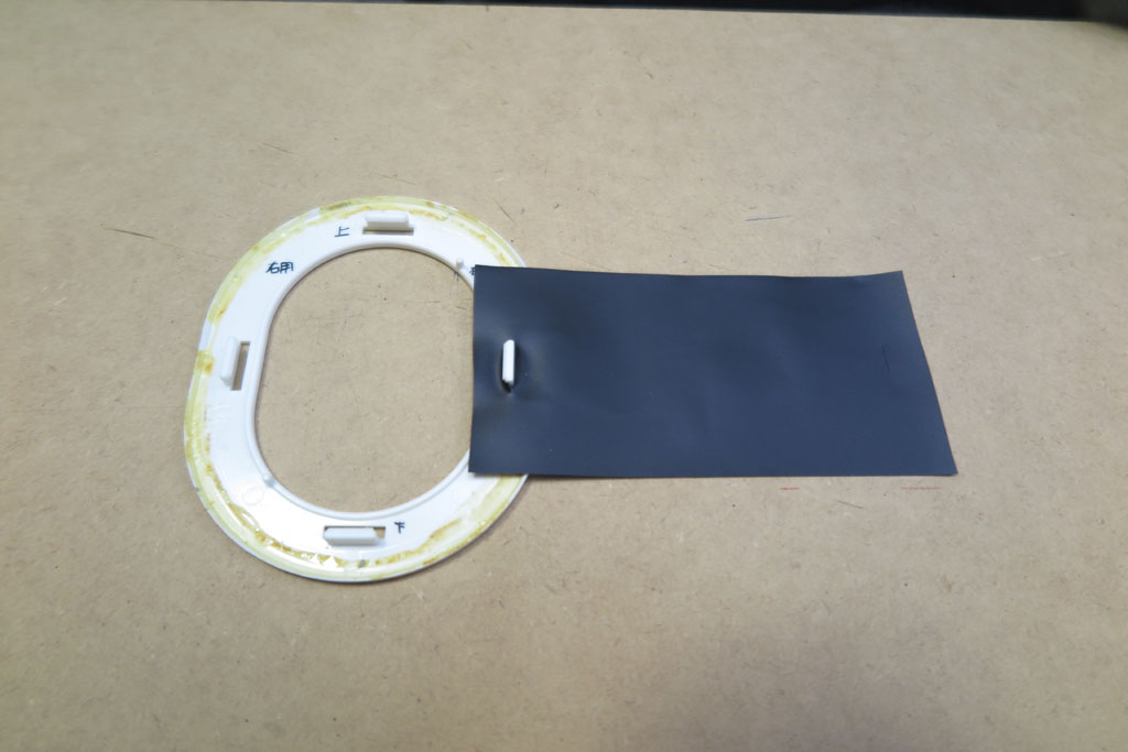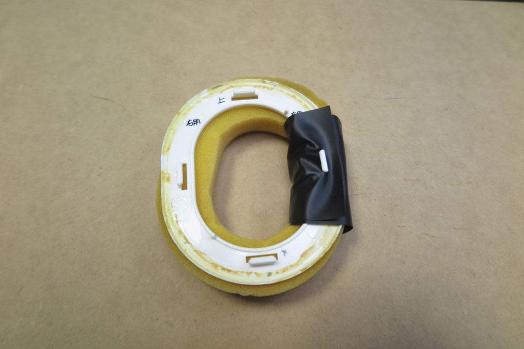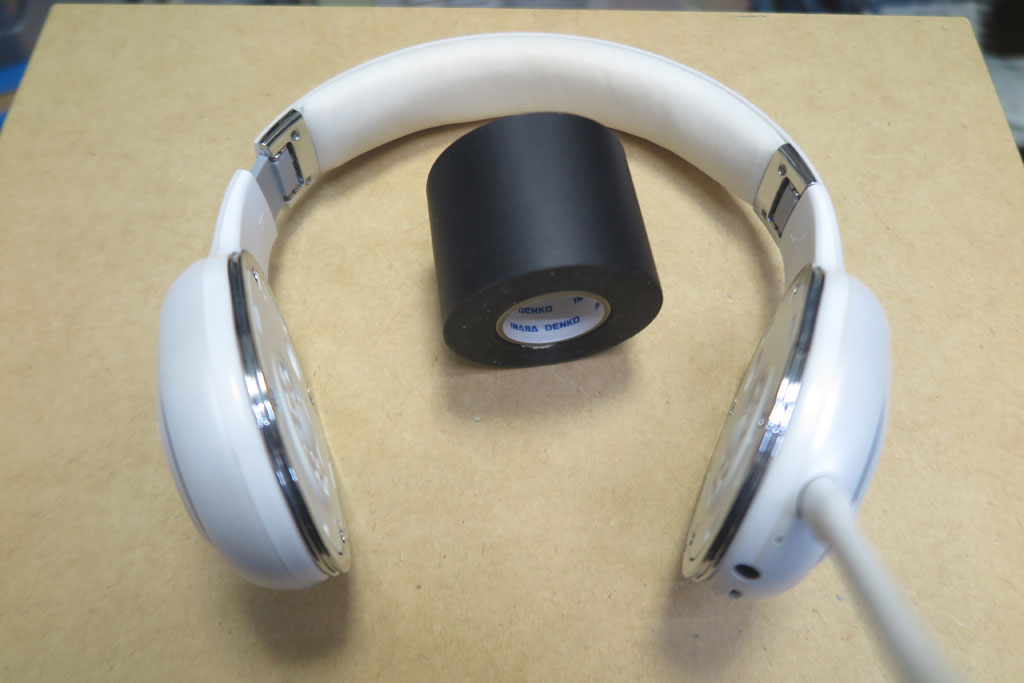 頭頂部クッションの外装として配管テープ巻き付けでやっつけてみた。ではイヤーパッド側も同様にチャレンジ。10cm程度でカットして少し穴をあけて、ヘッドホンとの取付フックに引っ掛けてみる。