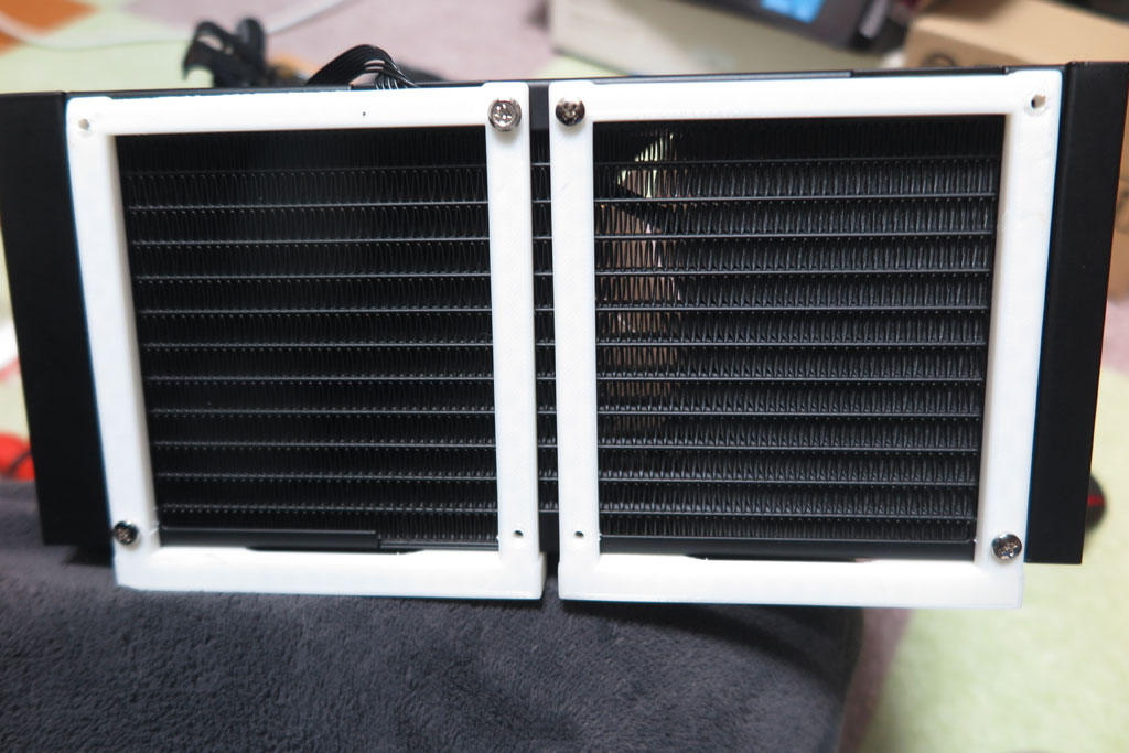 3D取付枠がうまく取り付け可能かをひとまずチェック。穴位置はファンをこちら側に取り付けることも考慮してあるので、 120mmファンの取り付け位置と同じねじ位置。どうやら問題なさそうだ。