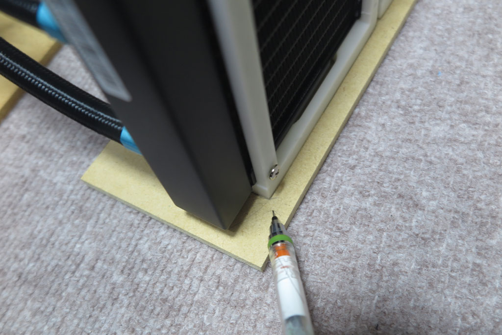 ではラジエータ取付枠をMDFに配置するため位置取りを行う。仮止めした取付枠をMDF板に乗せて鉛筆で位置決めをする。