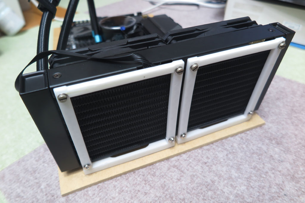 ラジエータを取付枠に固定して、完成。ほんの少しだが、ラジエータが安定して置けるようになった。 最終的にどのような配置とするかは考えていない。