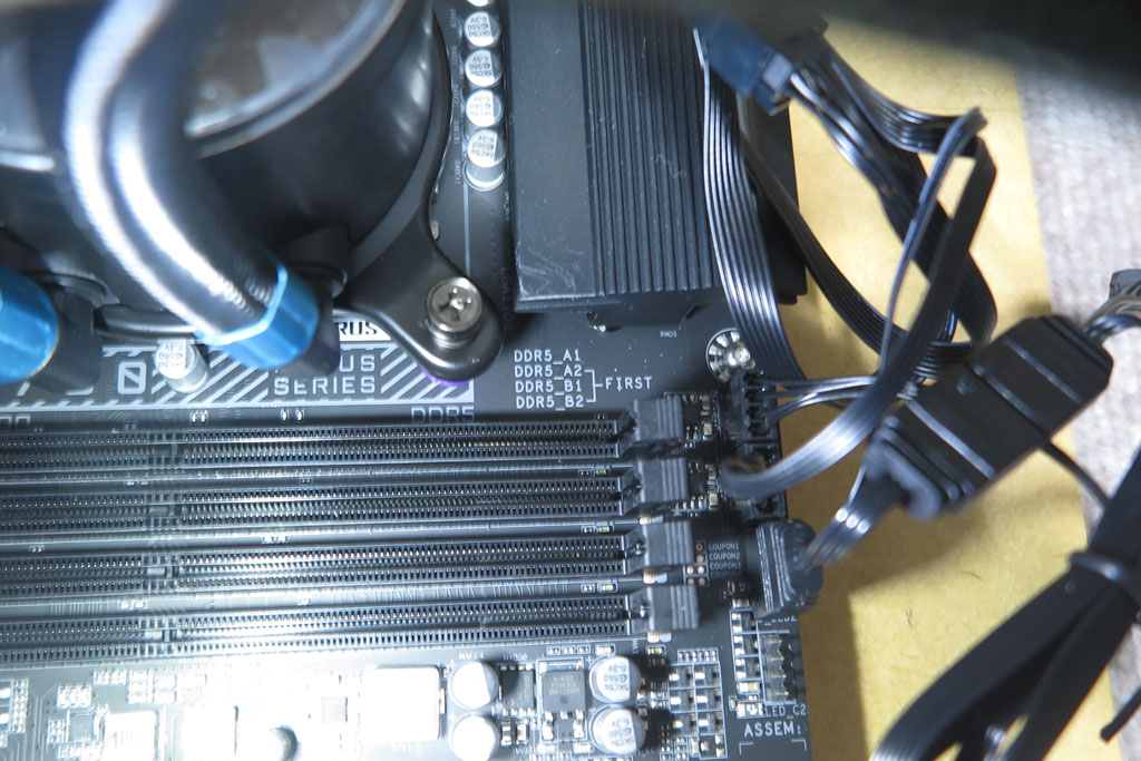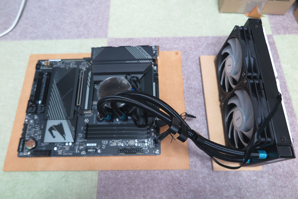 CPUクーラーのラジエーターだが、取り付け個所を考慮していなかった。 案外大きくまた水冷ホースの関係で、あまり自由な取り回しはできない。 実際のPCケースでも配置に苦労したかもしれないが、バラックだと自由なようで案外自由が利かない。