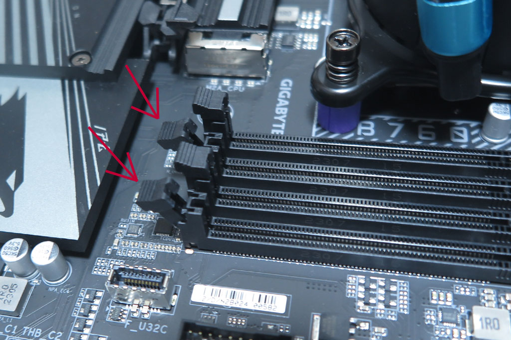 メモリソケットの差し込む一のラッチを開いて準備。