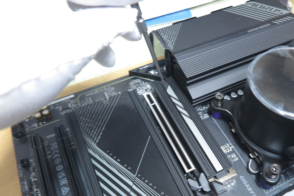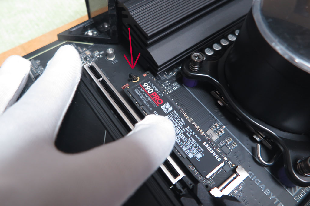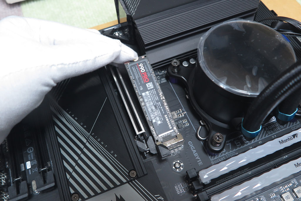 マザーボード真ん中あたりにメインのM2ソケットがある。M2用ヒートシンクを外して、990EVOをコネクタに差し込む。