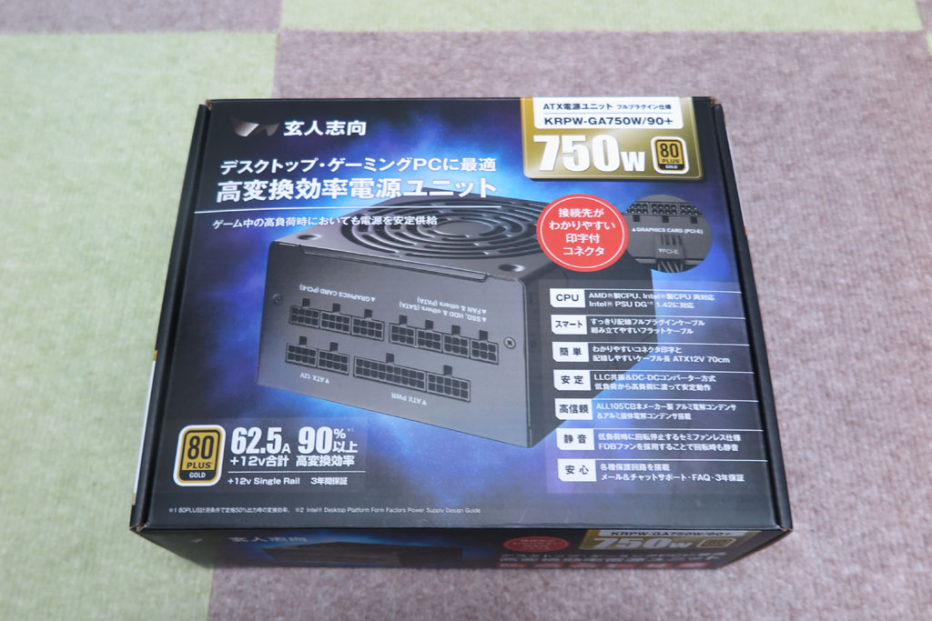 電源の準備を行う。昔とは電源も色々規格が変わってそうなので、 流用なんかはせず新しいものを購入。電源容量だけ気にしてそこそこサイズの750Wとした。 あと効率の基準もあるようで、goldというのを選択した。