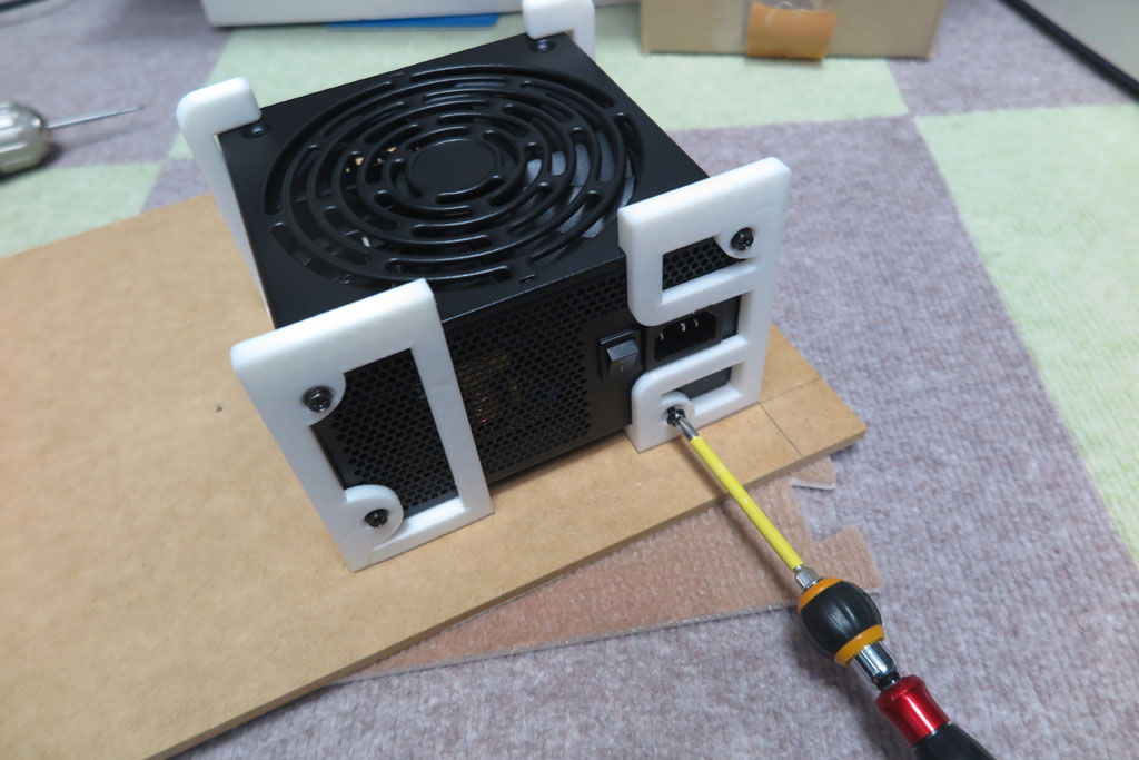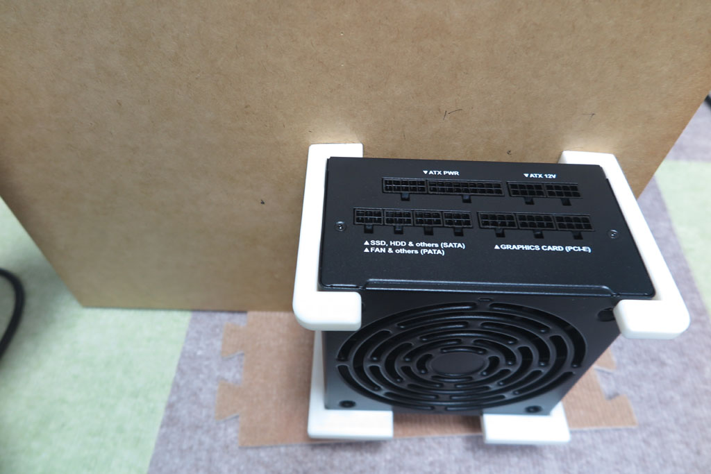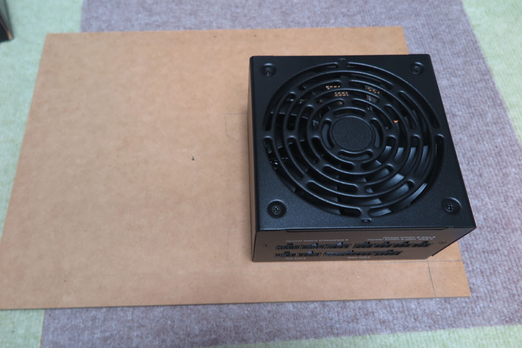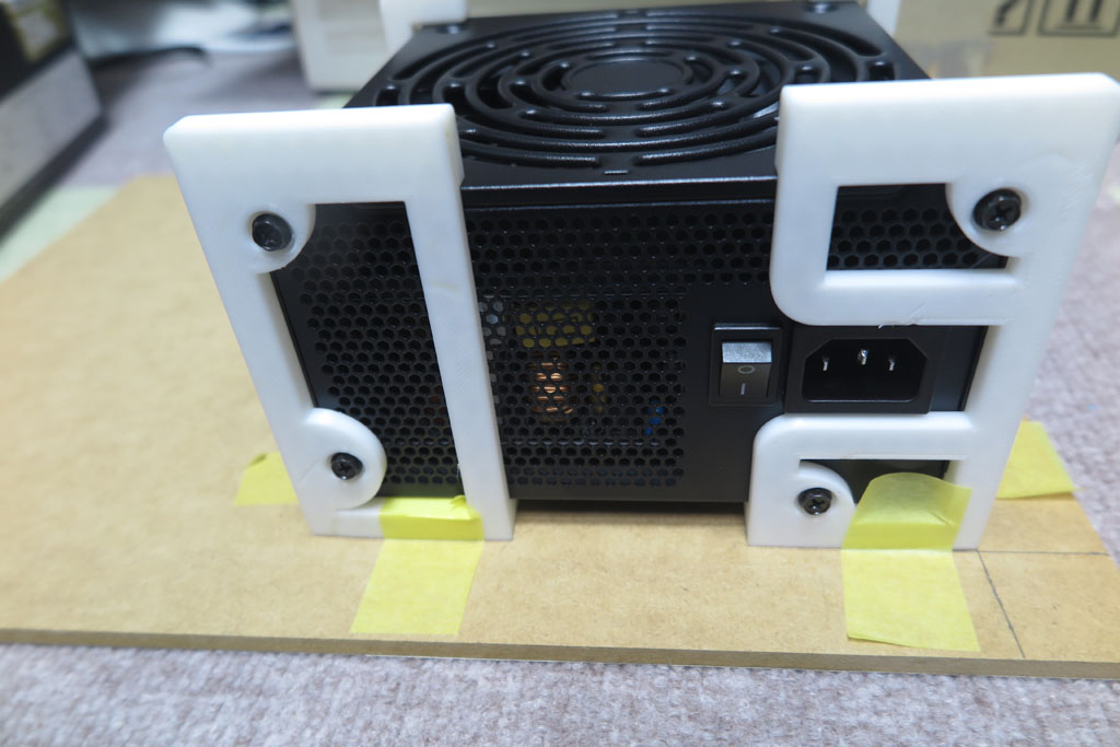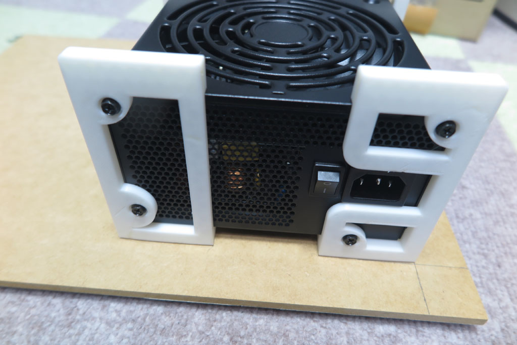 PCケースがないので、配置をどうするか悩むが、別のMDF板に取り付けようと思う。 マザーボードと並べれば電源ケーブルはそれなりに届くと思う。