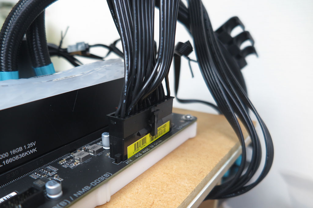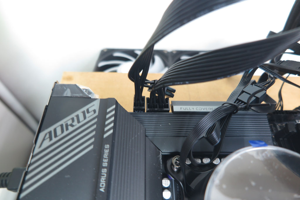 コネクタの不用分を外したまま、12ピン分をマザーボードに取り付ける。 コネクタが分割可能な分それぞれが小さくなってしまい、持ちにくく力が入りづらい。 マザーボードの周りの部品を壊さないように、力を入れて差し込む。