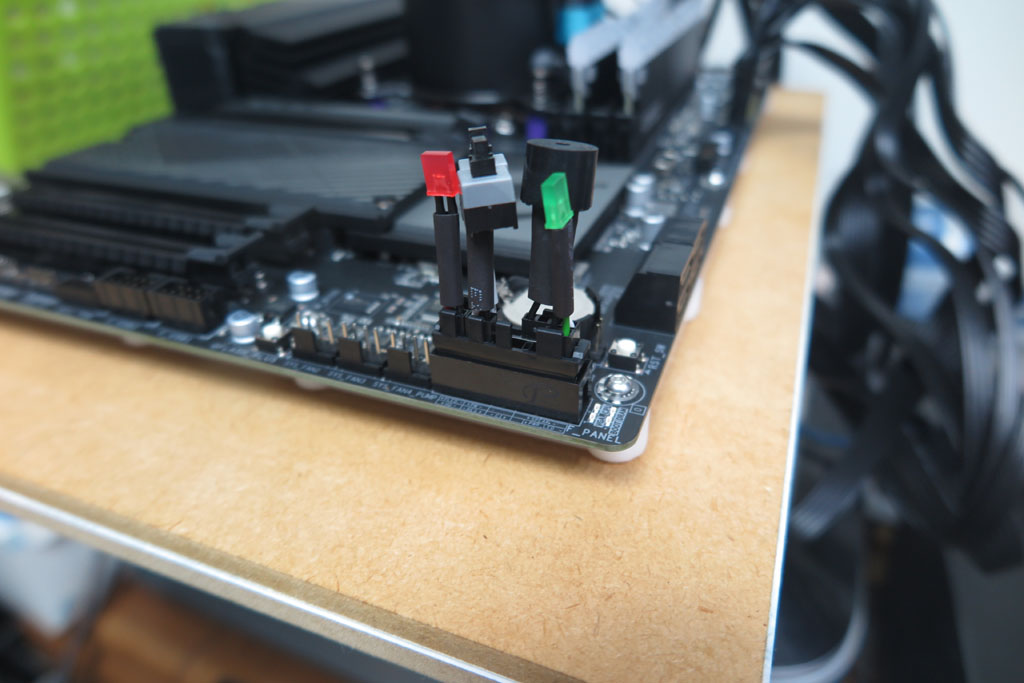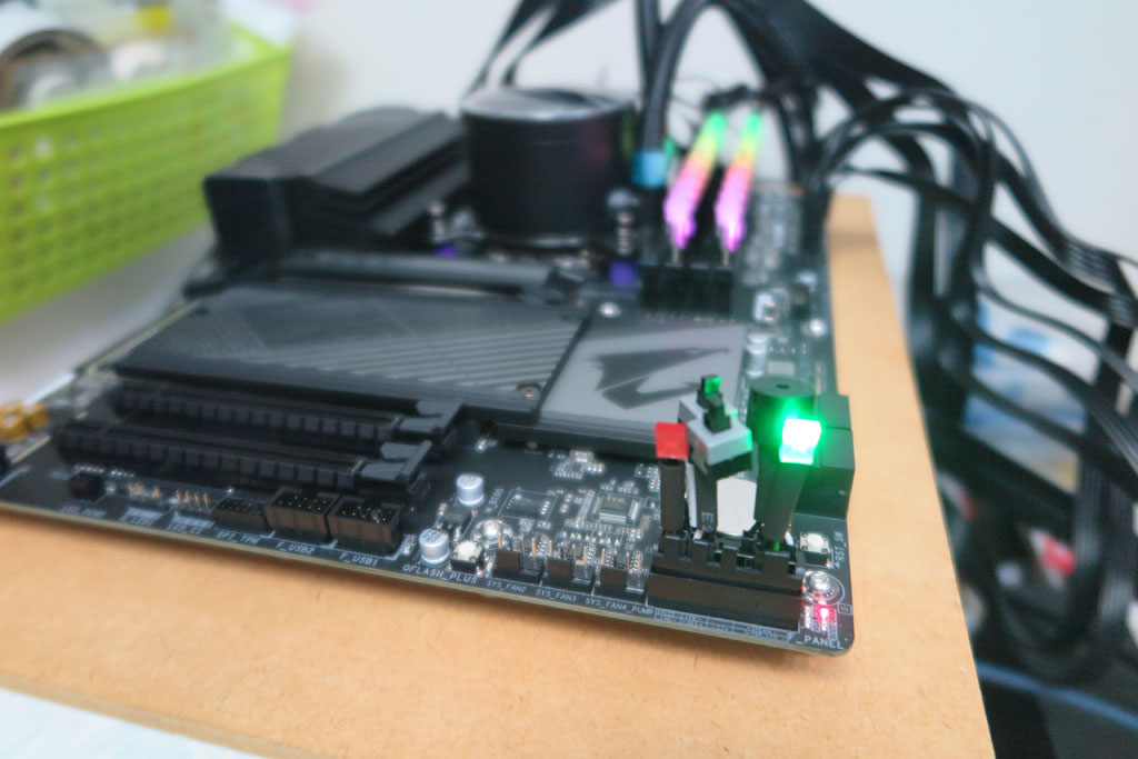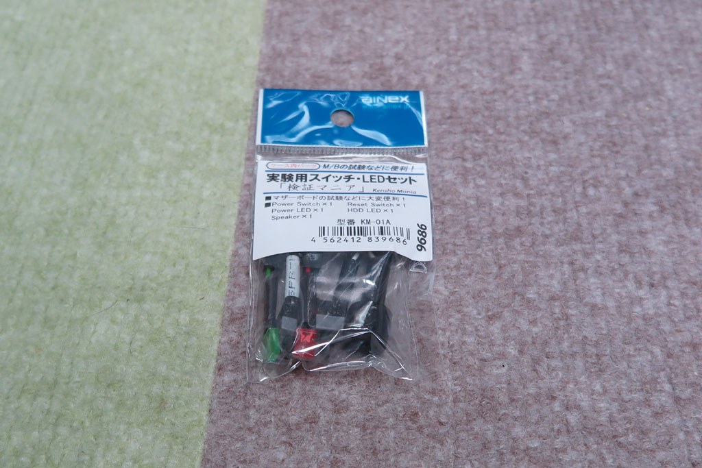 マザーボードに取り付ける主要部品は一通り取付完了となった。 後、起動させるためのベンチ用部品としてスイッチやLEDセットがあるのでこれを使用する。 通常はPCケースがあるので、そちらにスイッチ類が存在するが、今回はバラック状態なので、その代用品を用意。