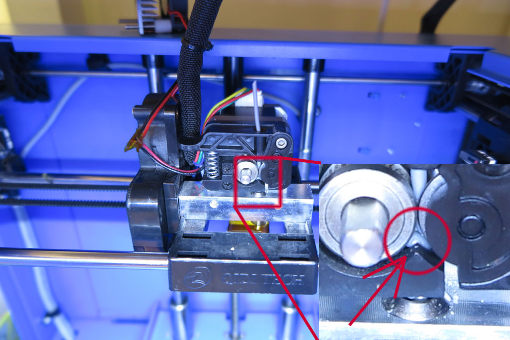 そして、新たに差し込み直そうとした時、事件は起きた。 エクストルーダのレバーを押しながら、上からフィラメントを挿し込む。これもなかなか硬いので、レバーを頑張って押さえつつ、 フィラメントをしっかり挿し込むと、思いの外すごく入っていく。なんだろ溶けてノズルからじゃんじゃん出ているのかと思ったが、 そうでもない。おかしいなともう少し押し込んでみると、「カリカリッ」っとおかしな音が。 なんだかファンの方で異常音がする。