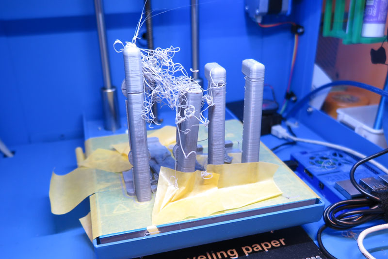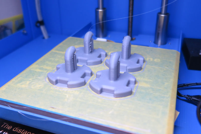 では、これを印刷。4つ並べて同時印刷。ひとつだけだと円柱部分をゆっくり印刷となって無駄に遅い。 4つあると冷却時間も稼ぎながら、それぞれの印刷となり、熱ダレしにくいはず。でも、ミスるとショックも4倍?