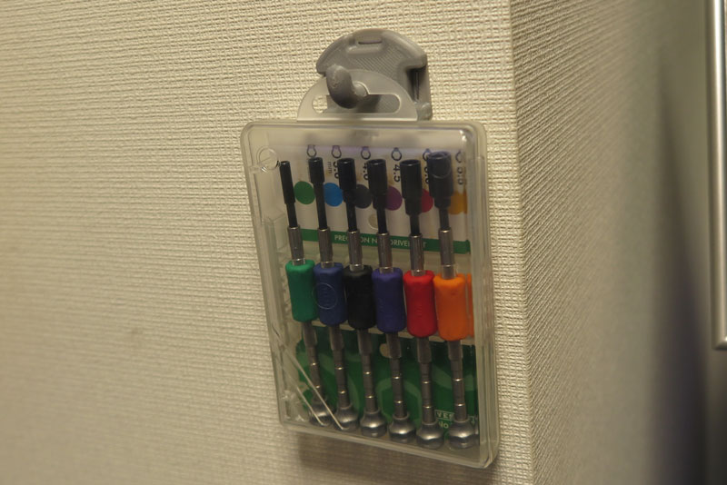 では、何かをひっかける。今回はナットドライバーをひっかけておく。なんだか商品の陳列コーナーみたい。 よく使うものは、こうして近くに壁掛けしておくと、すぐに取り出せて便利な気がする。 このままだと壁一面、フックだらけになっていきそうだ。