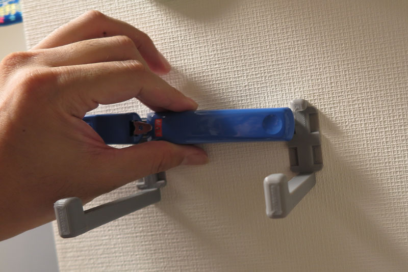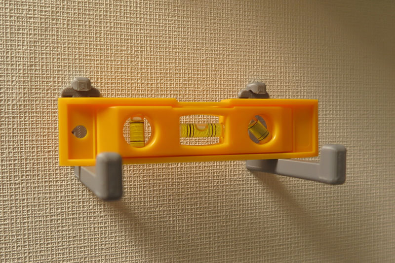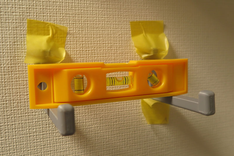 では、取り付け開始。まずは位置調整。2つのフックでケースを支えるのだが、斜めになっていては意味がないので、 しっかりと水平をとる。100均の水平器なのだが、DIYレベルにはこれで十分だ。スマホにも水準器があるが、スマホは重いので危険だ。
