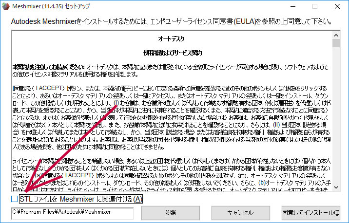 最初にライセンス同意が出てくるが、stlファイルの関連付けがチェックされているので、外しておこう。