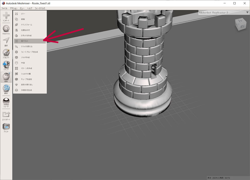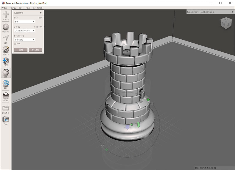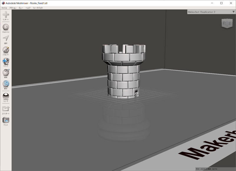 このMeshmixerは、主にSTLファイルの編集を目的として、使う想定。 では、STLファイルを読み込んでみる。 メニューの「ファイル」「開く」でやると「*.mix」ファイルを選択となる。Meshmixerファイルなのだろう。 STLファイルは「インポート」で可能なので、編集したいSTLファイルをインポートで選択してやる。 とりあえずは、チェスのコマ(ルーク)を読ませてみた。