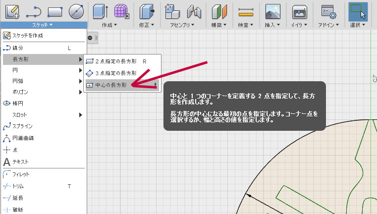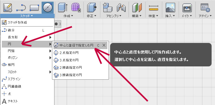 40mmのファンガードを作成するので、まずは基準となる40mmの円を作成。スケッチのメニューから「円」を選び、 その中から「中心と直径で指定した円」を選択。