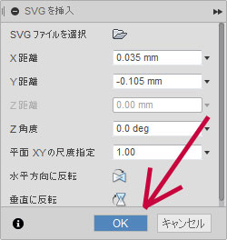 SVGが挿入されたのだが、位置と大きさが一致しないので、調整を行う。位置については丸いポッチをマウスでドラッグすると、 移動してくれる。ホイールで全体の拡大縮小できるので、細かい部分を確認しながらいい位置に移動させてやろう。 また、SVGの大きさについては丸いポッチの右下の、白い四角のさらに右下にある、三日月のようなのをドラッグすると、 拡大縮小してくれる。今回の40mmに合うサイズに合わせてやろう。