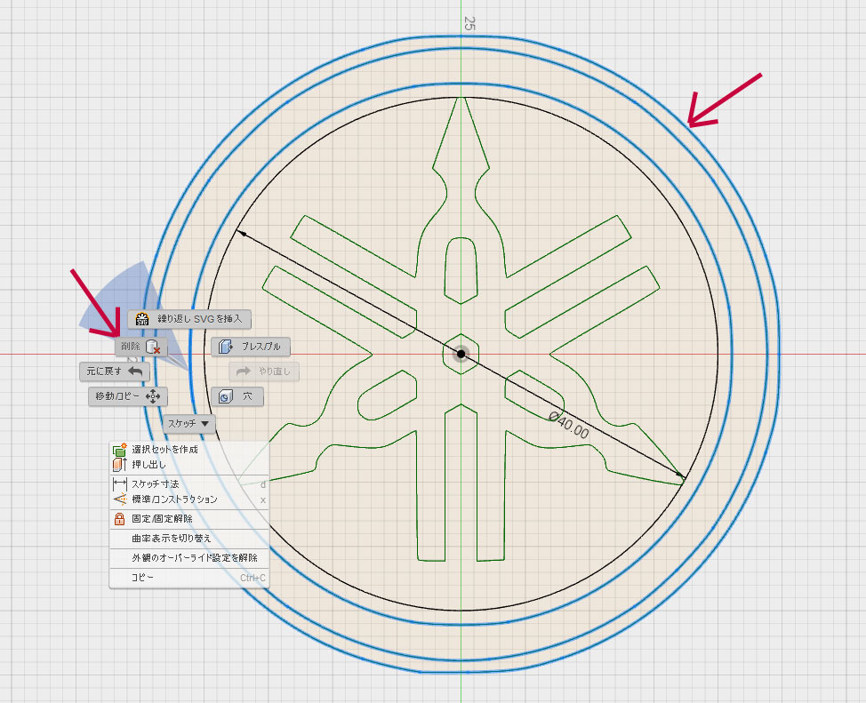 今回のSVGには音叉マークの外側に2重の円が含まれている。この円は今回邪魔となるので、取り除く。 円はスケッチ線として出来ているようなので、これを選択して削除する。Shiftキーを押しながら線をクリックしていくと、 複数選択をしていけるので、線以外は選ばないように慎重にクリックしながら不要な線を選び、 最後に右クリックして左上の削除を選ぶと、スケッチ線の削除ができる。