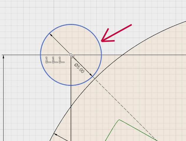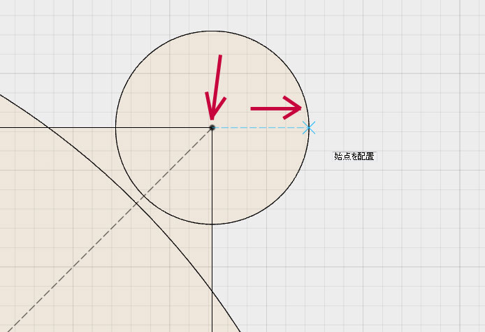 最初の点を選択する際に、まずはネジ穴位置の中心にマウスカーソルを持っていく。すると中心に吸着されるので、 そのまま右にマウスを移動していく。ボタンは何も押さない。青い点線と一緒にカーソルは移動していき、ネジ穴円に触れると、 また吸着。この位置が円の真横の接点位置となるので、ここでクリック。円弧の最初の点はこことする。