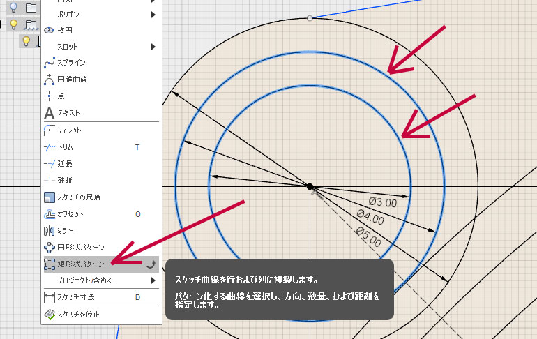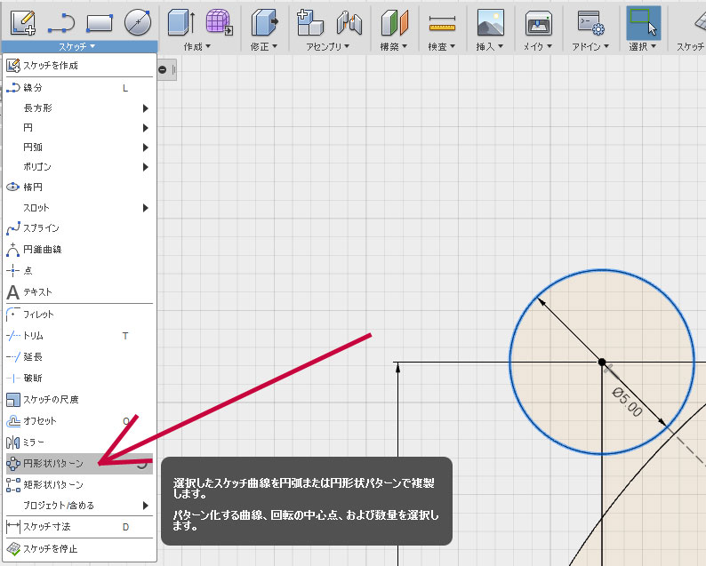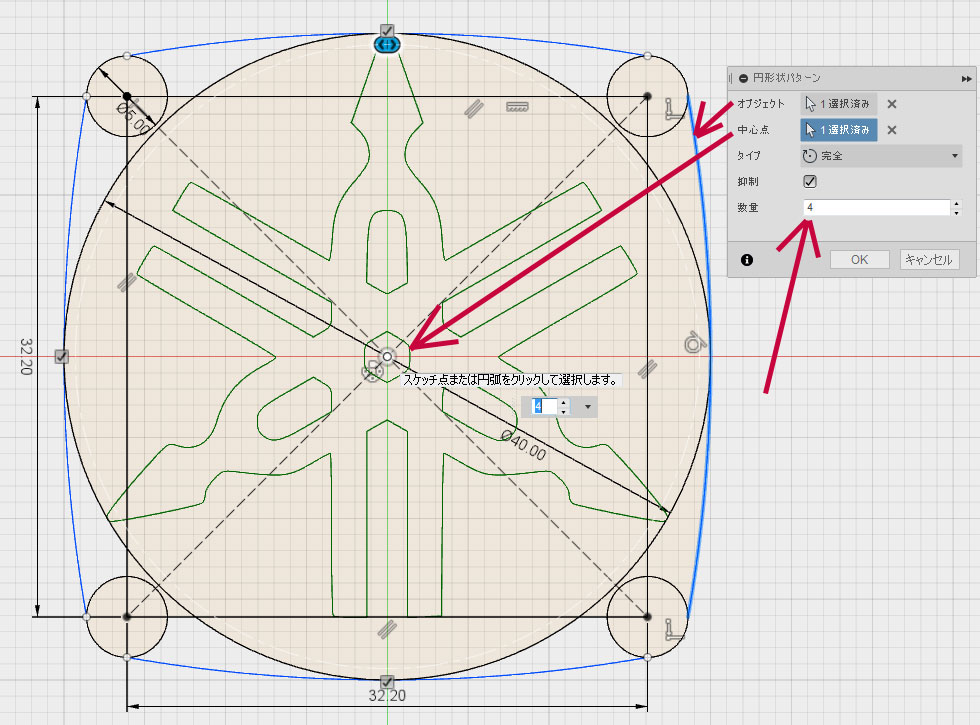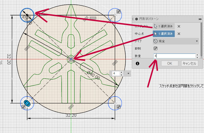 次に同様に残り3つを作成するのだが、ここで小技を使ってみる。スケッチメニューの「円形状パターン」を選択。