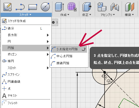 さて、40mmのファンの目の前のガード部分と、ネジ位置部分は作れたので、主要箇所は完成。 でも全然ファンガードな形とはなっていない。40mm円の外側を作成してやろう。 ねじ穴位置を覆うくらいの四角形にすればいいだろうが、ちょっと凝って作ってみる。 まずはスケッチメニューの「円弧」から「3点指定の円弧」を選択。