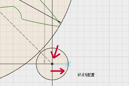 同様に今度は右下の円でも同じことを行い、ネジ穴円の接点位置でクリックして、円弧の2点目とする。