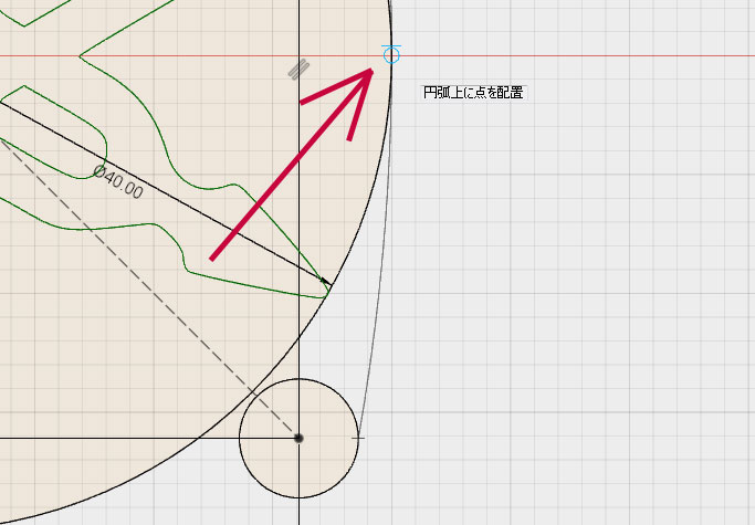 最後に真ん中右位置の40mmの円の出っ張っている辺りにマウスを持っていくと、変なマークとともに吸着するので、 ここで3点目をクリック。これで、3箇所をつなぐ円弧が出来た。