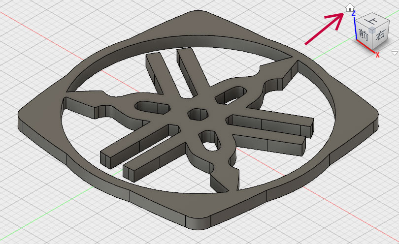最後に「距離」部分に2(2mm)を入力して決定すれば、2mmの厚みでボディが出来上がる。 正面から見ていると、厚みができているのが見えないので、右上にマウスカーソルを持っていき、キューブの左上にある 「家」アイコンを押せば、斜め上から見せてくれる。これがファンガードのグリル部分が完成。
