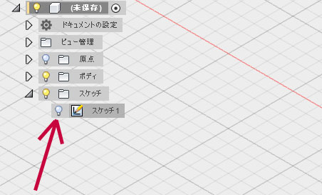 何か物体ができて安心。では次に足の部分の作成に入る。押し出しでボディを作ったあとはスケッチの表示が消えているようなので、 左の表示ツリーからスケッチを表示させてやろう。電球マークが灰色に消えていたら、非表示。 電球をクリックすれば黄色くなって表示状態となってくれる。また、ここの名前は変更できるので、 たくさんに増えてどれがどれだかわからなくなったら名前を入れておこう。