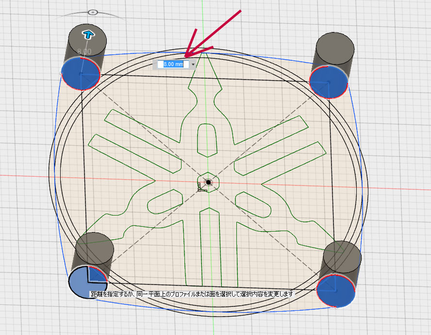 上側2つはファンのネジ穴に入り込むこととなるため、少し高い突起を作る必要がある。 先程4つとも同じ高さの円柱を作成したが、上2個と下2個ではそれぞれ違う作りとなるため、 4つまとめちゃ駄目だった。もう一度フューチャ編集を行い、下の2つだけ選択して円柱作成にしよう。