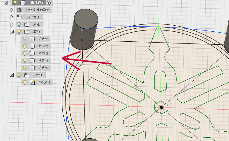 すると4つの円柱が作成された。そしてボディも4つ追加された?!。ちょっと予定と違う。