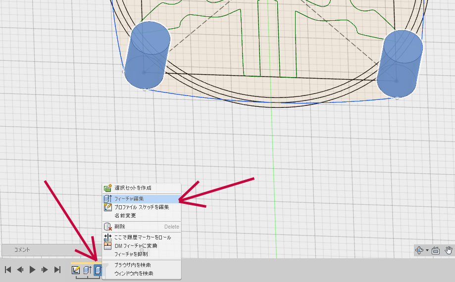 ここで、Fusion360の便利機能を活用。下の方にある履歴では、最初の押し出しと、次の円柱作成の押し出しが出来ている。 直前実施した2個めの押し出しを右クリックし、「フューチャ編集」を選択する。