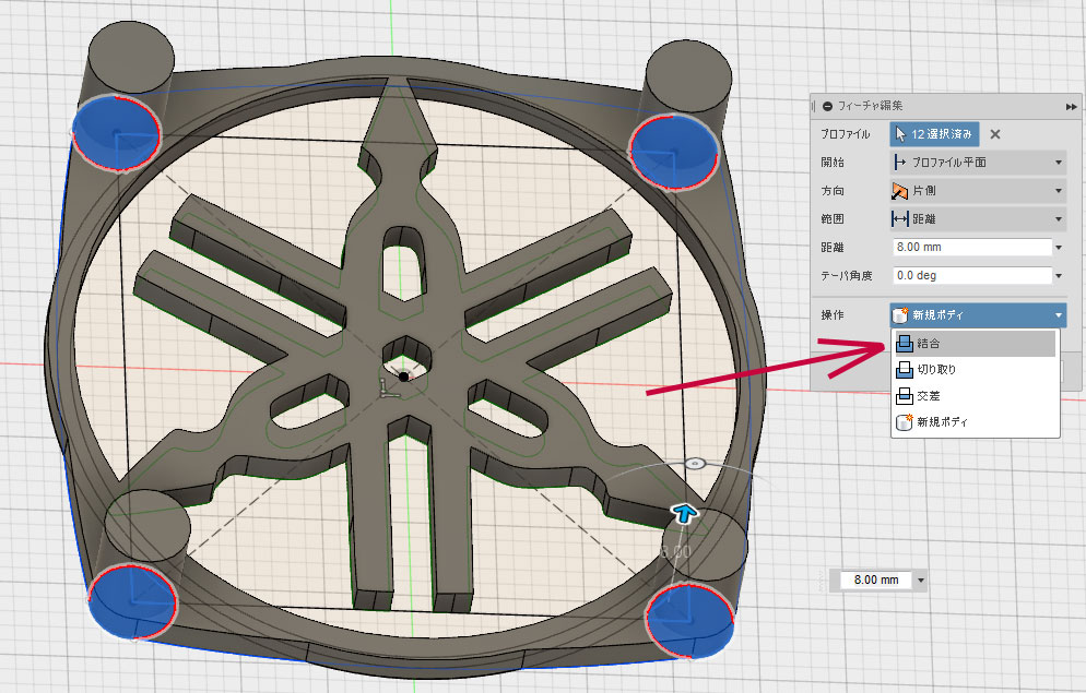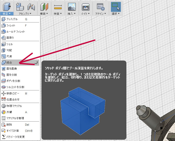 これで、ファンのネジ穴に刺さる突起部分が出来た。ボディを一体化させるため、突起の傘部分をひとつのボディにしよう。 修正メニューから「結合」を選択する。