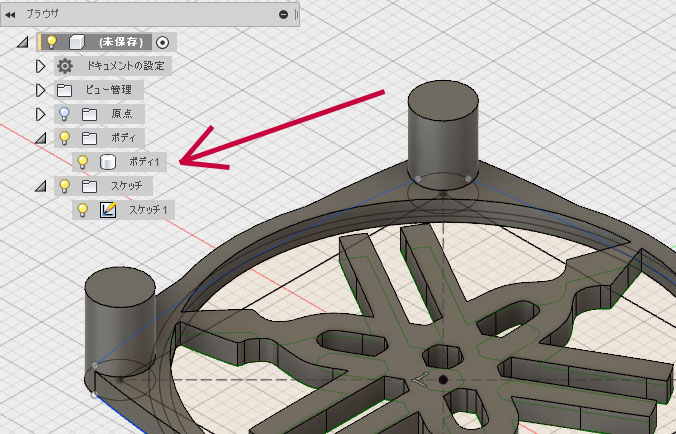 次に足を作成する。4隅に作ったスケッチの円から円柱を作成する。スケッチを表示させて円を選ぶのだが、 ボディが表示されていると邪魔なので、先程同様左の表示からボディの電球を消して非表示にしてやる。 そして作成メニューの押し出しを選択し、4隅の円をシフトキーを押しながら選択したら、8mmで作成する。