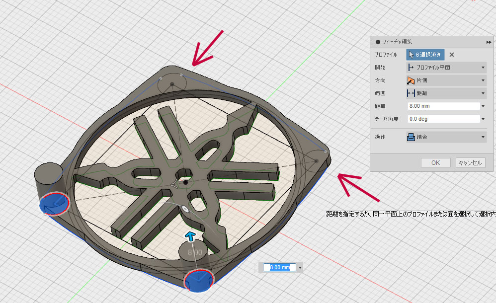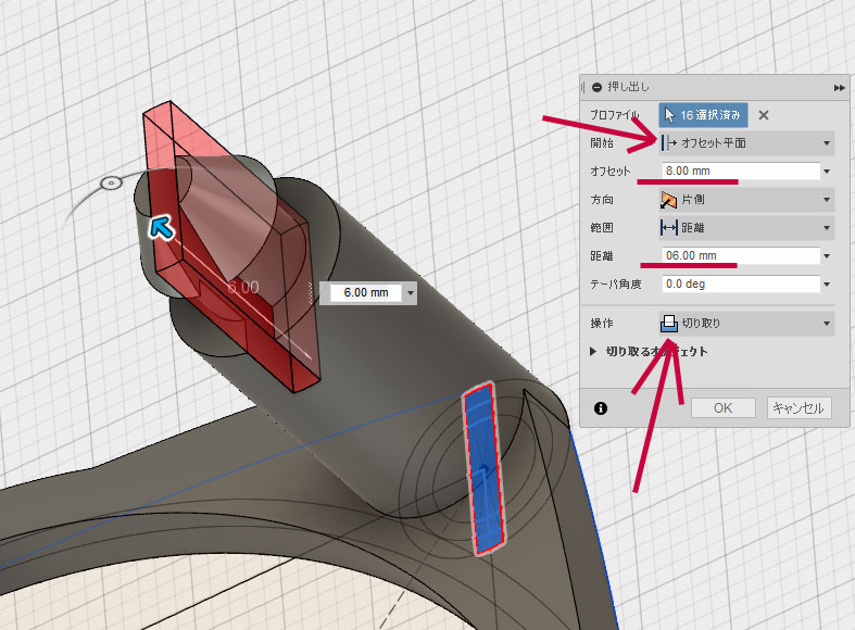では、最後にひと手間、突起部分に割れ目を差し込んでおく。作成メニューの押し出しを選んだら、 スケッチの上側の円の中に作った長方形を左右とも選択し、オフセット平面での押し出しを行う。 オフセット値は8mm、距離は6mm、操作は切り取りを設定する。すると、突起物の真ん中に切り込みが入る。 うまくバネになってファンのネジ穴に引っかかる予定だ。