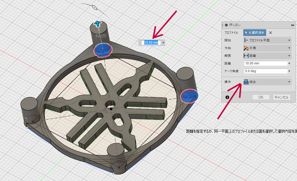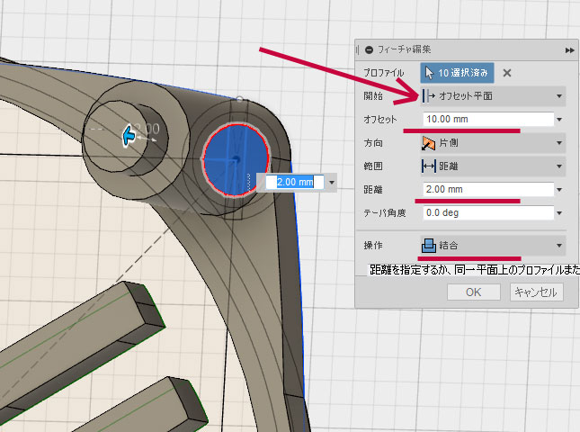 では、一旦スケッチは完了。スケッチの停止を押す。そして、作成→押し出しを行い、3mmの円柱の作成を行う。 円柱は上側の左右の3mmの円を全選択する。いろんなスケッチ線が入り、円が分割されているが、全円となるよう全選択する。 そして、右側にある押し出しの設定で「開始]の部分を「プロファイル平面」から「オフセット平面」に変更。 するとオフセット値の設定箇所が出てくるので、ここに10mmを入れる。 そのほかは、距離を2mmとし、結合で作成する。