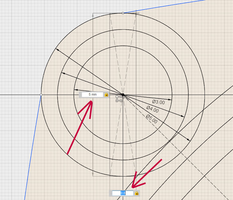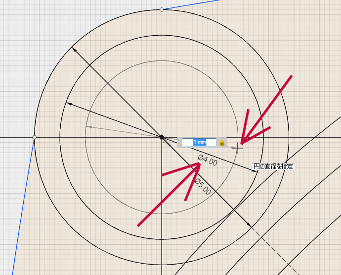 次に左上のネジ穴部分を拡大し、同心円にて4mmの円と3mmの円を作成する。