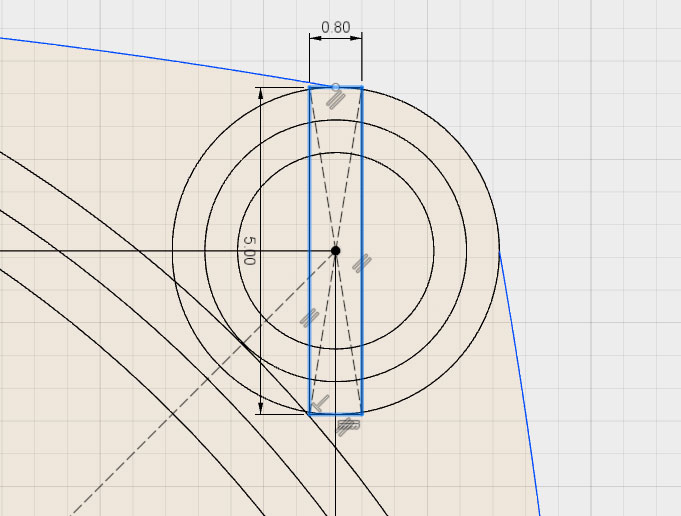 あ、バネっぽくするから割れ目も必要だった。ちょっと四角を追加作成する。 スケッチメニューの長方形から「中心の長方形」を選択し、円の中心を選んだあと、5mmx0.8mmで四角形を作成。