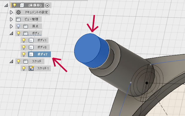 すると、新規ボディとして先っちょの4mm円柱が2つ作られた。左のボディもボディ1に対して、ボディ6とボディ7が増えた。