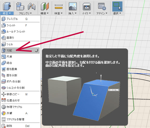 次に修正メニューから「勾配」を選択する。これを使って円柱に勾配を付けてやる。