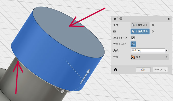 勾配の設定で、「平面」には一番上の円柱の裏面を選択、「面」には上側の面を選択する。 表側と裏側なので、選択するときはぐるぐる絵を動かしてうまく選択してやる。