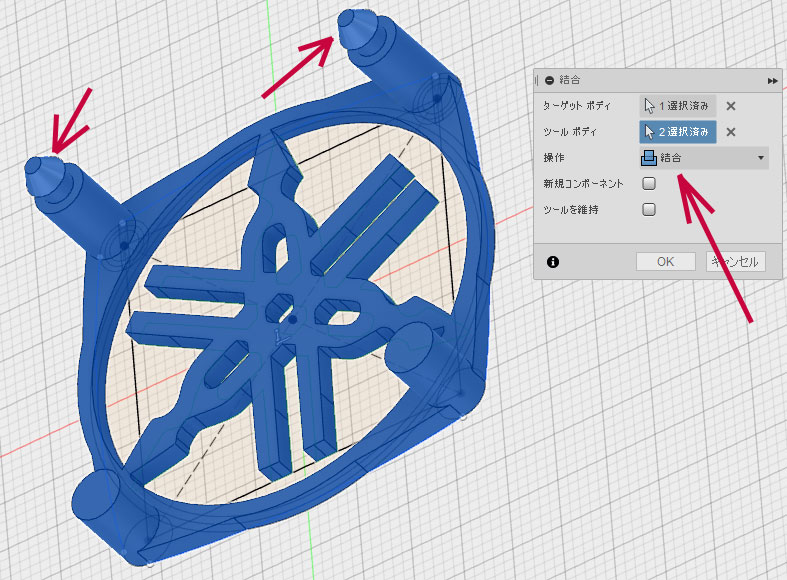 ターゲットボディはボディ1(本体部分)を選択し、ツールボディには突起部分の2つをシフトキーを押しながら複数選択する。 「操作]を「結合」にして、OKを押せば、ボディが1つに結合される。