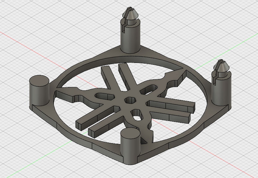 ファンガードな雰囲気の何かが出来上がってきたが、まだ使える状態には程遠い。 エクストルーダのファンガードとして作成するので、上2箇所のネジ箇所には突起物を作成して、 ファンのネジ穴に挿し込むようにする。下側ネジはネジが入っているため、ただのスペーサとなる。
