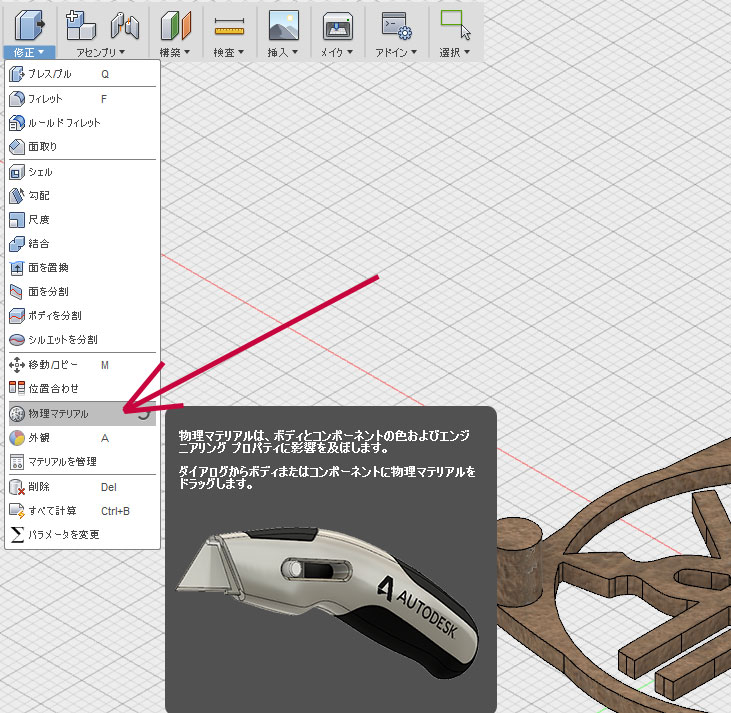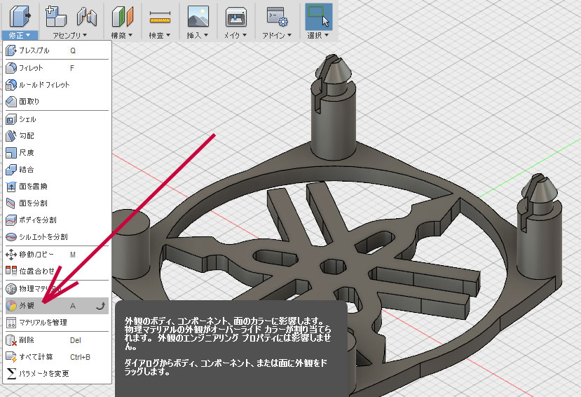 モデリングとしては完成したが、少しお遊びをしてみる。 修正メニューの中に「外観」というのがあるのでこれを選択してみる。