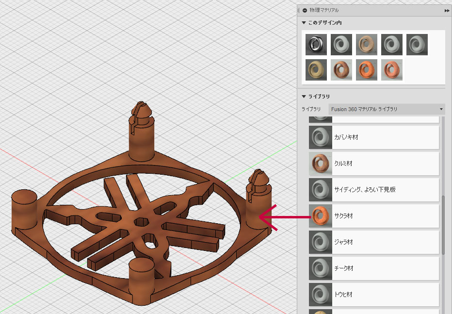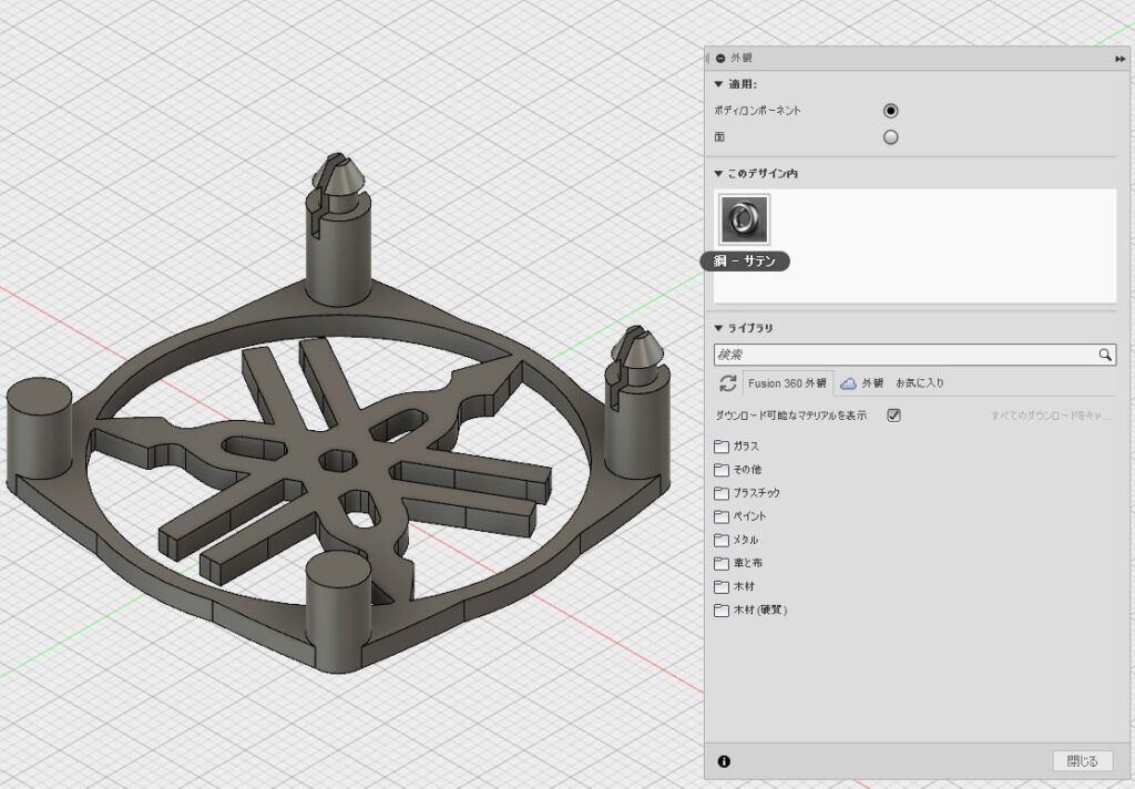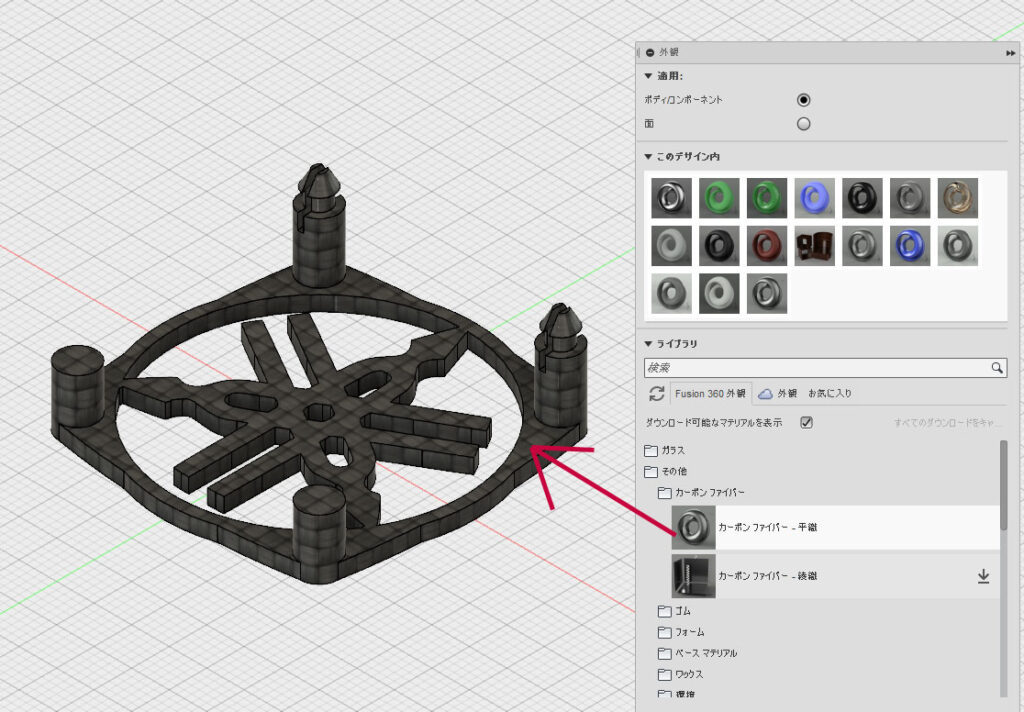 右の下側に外観の素材が色々あるので、色々と開いてみる。良さそうなのがあったらマウスでドラッグして、ボディに落とす。 するとその外観が適用される。外観の素材の右側に矢印がついているのはダウンロードが必要らしく、矢印を押すとダウンロード開始。 数秒で使えるようになる。ボディ単位に適用できるようなので、 複数ボディがあって区別したい場合には色を変えた外観にしておくと便利かも。