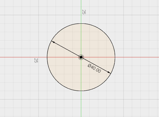 まずは絵の中心をクリックして円の中心を設定。その後マウスを動かすと円が出てくるが、40mmの円を作成するので、 そのままキーボードで40を入力すると、数値指定で円が書ける。(mmは入力不要。Enterを押すと勝手に表示してくれる)