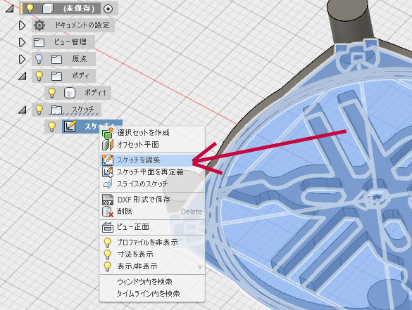 今回のSVGには音叉マークの外側に2重の円が含まれている。この円は今回邪魔となるので、取り除く。 円はスケッチ線として出来ているようなので、これを選択して削除する。Shiftキーを押しながら線をクリックしていくと、 複数選択をしていけるので、線以外は選ばないように慎重にクリックしながら不要な線を選び、 最後に右クリックして左上の削除を選ぶと、スケッチ線の削除ができる。