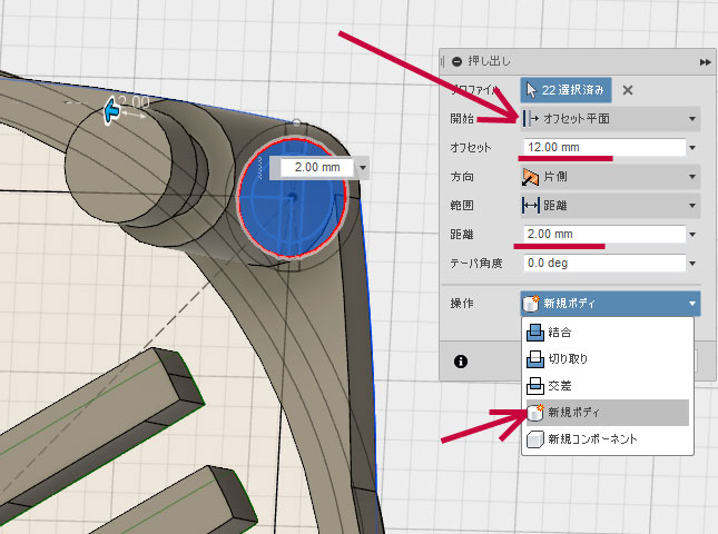 もう一つ同様に、4mmの円を左右とも同様に選択して、円柱の作成。これもオフセット平面を利用して、オフセット値は12mm、 距離は2mm、そして操作の部分では「新規ボディ」を選択しておく。