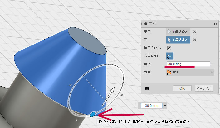 勾配の設定で、「平面」には一番上の円柱の裏面を選択、「面」には上側の面を選択する。 表側と裏側なので、選択するときはぐるぐる絵を動かしてうまく選択してやる。